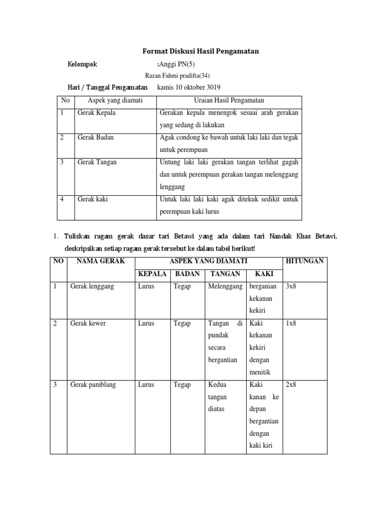 Aspek yang diamati uraian hasil pengamatan 1 ragam gerak (kepala, badan, tangan dan kaki) 2 teknik gerak (kepala, badan, tangan dan kaki) aktivitas menanyakan setelah mengamati pertunjukan tari dari sumber lain seperti internet, menonton pertunjukan tari langsung atau melalui vcd, dan sumber belajar lainnya.